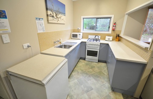 Kitchen - Well equipped with crockery, cutlery and cooking utensils. There is a gas four burner stove and gas oven. The kitchen also has a full size electric fridge, chest freezer and microwave
